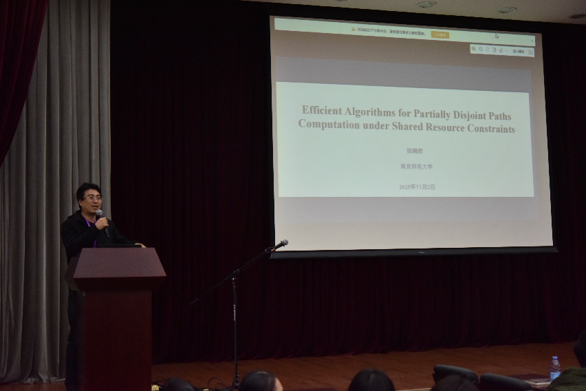 张晓岩教授作了题为《部分不交路算法及应用》的学术报告,重点介绍了在网络可靠性背景下高效计算具有共享资源约束的部分不相交路径的最新研究成果。他提出的新算法显著提升了求解效率,并在实验中验证了其优越性能,为网络容错与资源优化提供了重要的理论支持与方法创新。