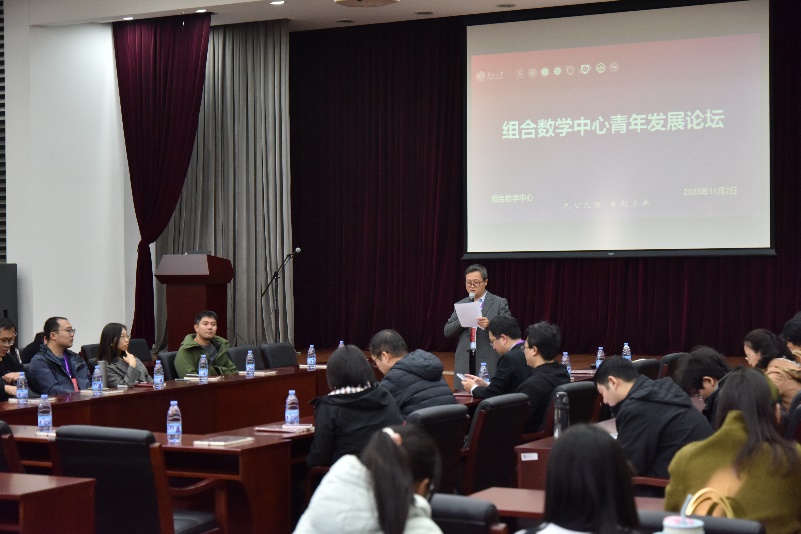 2025年11月2日下午,在南开校友总会数学校友分会成立大会召开之际,组合数学中心成功举办“组合数学中心青年发展论坛”。论坛由组合数学中心副主任吴腾主持,邀请学界与业界杰出校友,与中心师生围绕AI前沿、职业规划、科研热点等议题展开深入交流。上海域圆信息科技有限公司董事长袁元、南京师范大学数学科学学院张晓岩教授应邀作专题报告,十余名组合数学中心及大数学学科校友参与交流。
