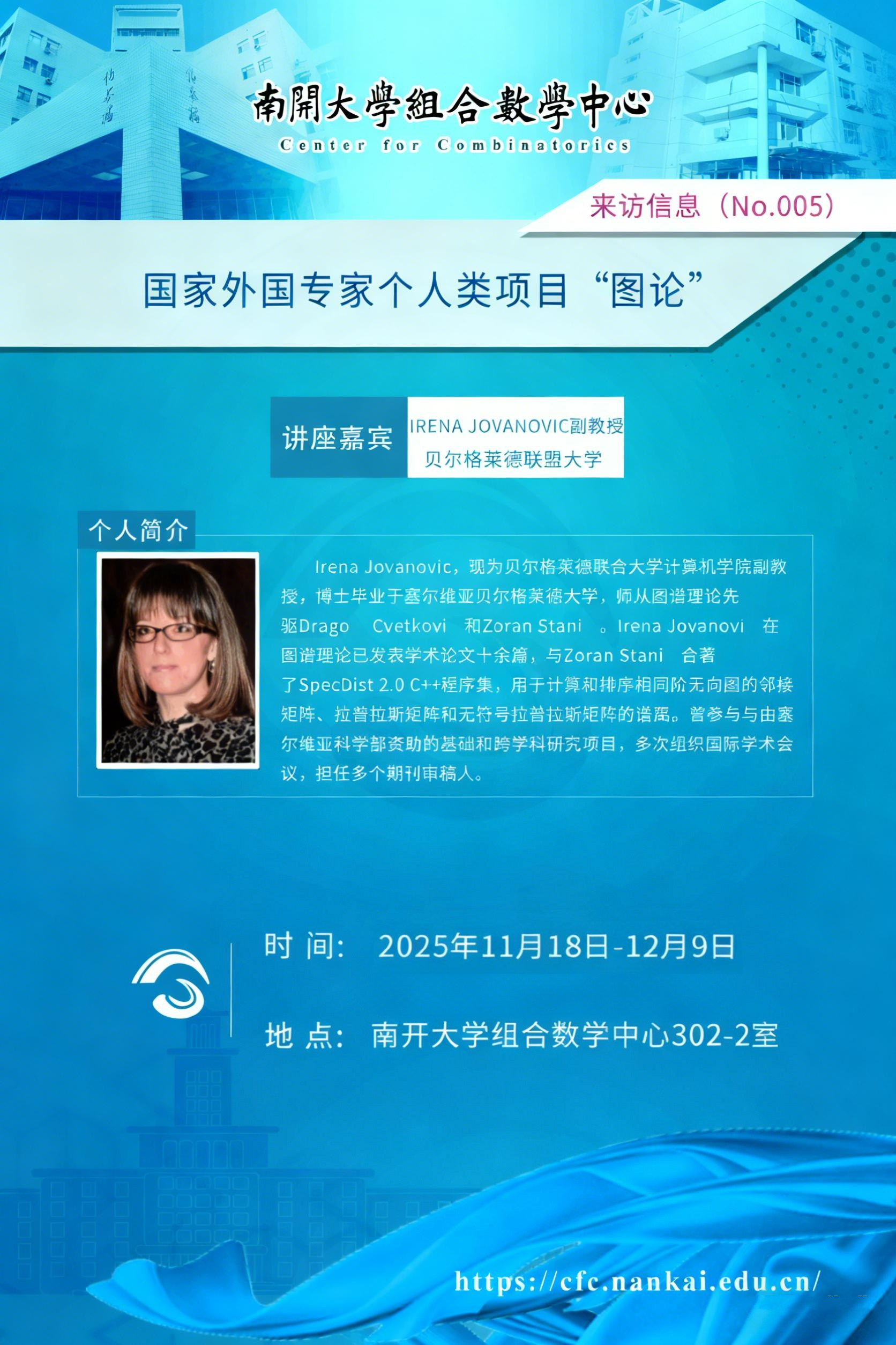在社会保障与人力资源部外专局项目的资助下,塞尔维亚贝尔格莱德联合大学Irena Jovanović副教授于2025年11月18日-12月9日访问组合数学中心,与李学良教授领衔的图论团队开展学术交流与合作研究。(更多信息请见来访报告)