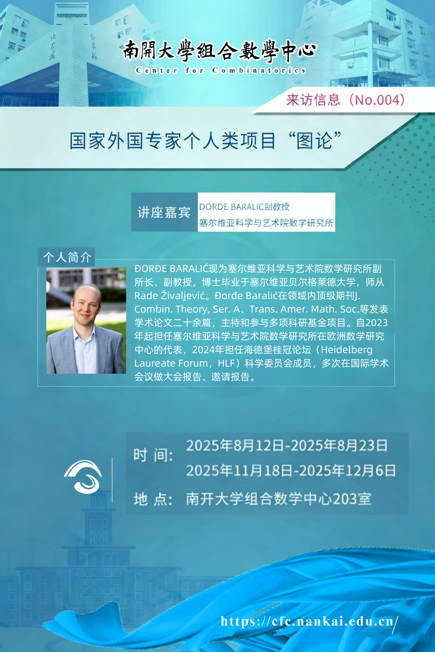 在社会保障与人力资源部外专局项目的资助下,塞尔维亚科学与艺术院数学研究所副所长Dorde Baralić副教授于2025年8月12日-8月23日,以及11月18日至12月6日访问组合数学中心,与李学良教授领衔的图论团队开展学术交流与合作研究。(更多信息请见来访报告)