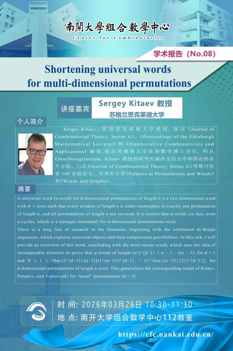 苏格兰思克莱德大学Sergey Kitaev 教授应邀访问组合数学中心